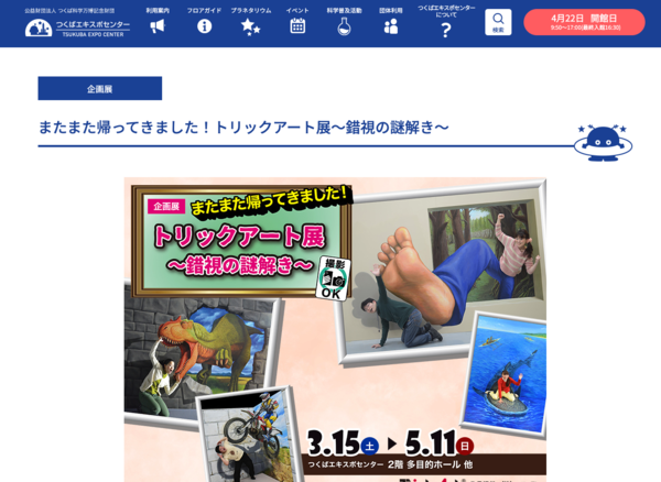 「トリックアート展」が、ついに帰ってきた。公益財団法人つくば科学万博記念財団が主催する本展示は、3月15日から5月11日まで開催され、場所は2階の多目的ホール等である。
