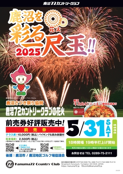 栃木県鹿沼市に位置する鹿沼72カントリークラブが、5月31日に「鹿沼を彩る一尺玉2025」という名の一尺玉花火大会を開催する。エリア内でも特に標高の高い216mから打ち上げられる1000発の花火が、鹿沼市の夜空を一夜限りの美しい色彩で満たす予定だという。