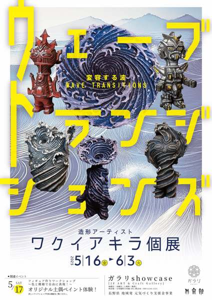 個展のタイトル「Wave Transitions(ウェーブ・トランジションズ)」には、変化し続ける波を通じてエネルギーや記憶を表現したいというワクイアキラの思いが込められている。展示される作品には、小布施町にゆかりのある葛飾北斎の『上町祭屋台天井絵 怒濤図』をオマージュした土偶や火焔土器が含まれており、無料で鑑賞することが可能だ。場所は北斎館隣の「ガラリShowcase」で、営業時間は10:00から16:00まで、水曜日は定休日となる。