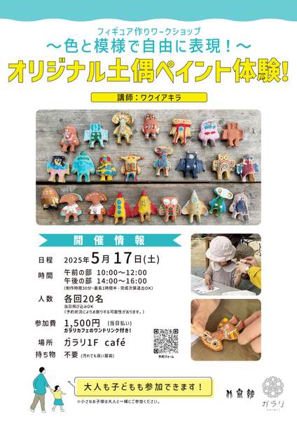5月17日には、特別な陶芸ワークショップ「オリジナル土偶ペイント体験」が開催される。このワークショップはワクイアキラを講師に迎え、子どもから大人まで楽しめる内容となっている。参加費は1500円で、ガラリカフェの1ドリンクが付いてくる。各回20名限定で、事前予約が推奨されているが、空きがあれば当日参加も可能だという。