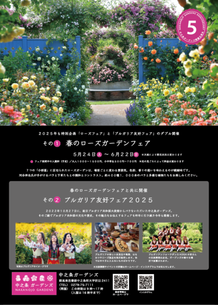 群馬県中之条町が誇る「中之条ガーデンズ」にて、5月24日から6月22日の期間、「春のローズガーデンフェア」と「ブルガリア友好フェア」が同時開催される。この期間中、約400種1000株のバラが咲き、訪れる人々を楽しませるという。「中之条ガーデンズ」はこの時期が最も美しい季節を迎える場所で、ローズガーデンフェアではバラと共に異国情緒あふれるブルガリアとの文化交流をテーマにした催しが堪能できる。
