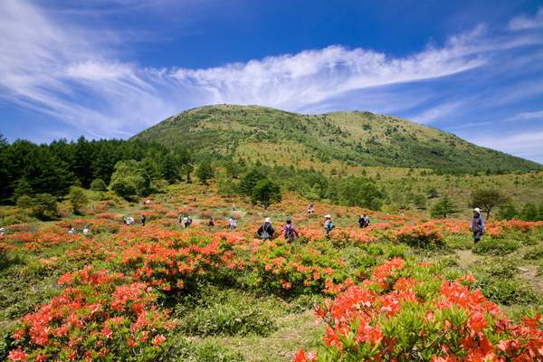 群馬県吾妻郡嬬恋村に位置するリゾートホテル「休暇村嬬恋鹿沢」から車で約10分の距離にある湯の丸高原では、毎年6月上旬から下旬にかけて、約60万株のレンゲツツジが山肌一面を朱色に染め上げる。