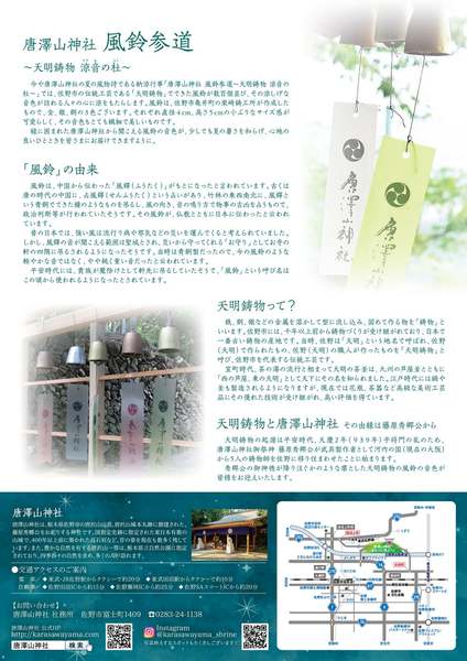 7月12日から8月24日にかけて、唐澤山神社にて「風鈴参道~天明鋳物 涼音の杜~」が開催される。このイベントでは、佐野市の伝統工芸である「天明鋳物」の風鈴が数百個並び、訪れる人々に涼やかな風と音色を届ける。