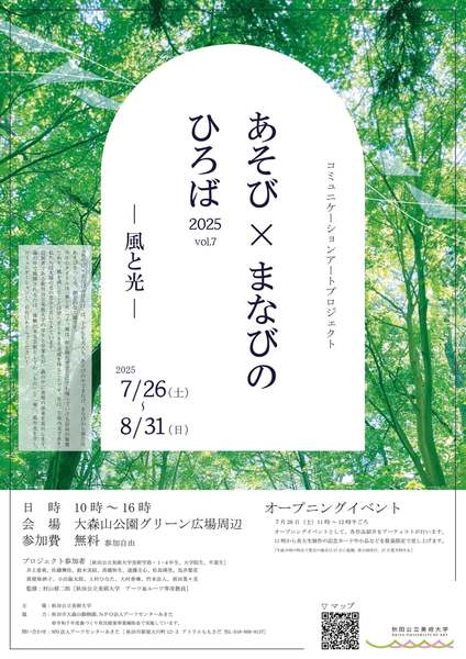 秋田公立美術大学は、「あそび×まなびのひろば 2025[Vol.7] 風と光」を2025年7月26日から8月31日まで、秋田市大森山公園グリーン広場で開催している。参加費は無料で、子供から大人まで誰でも楽しめる内容となっている。