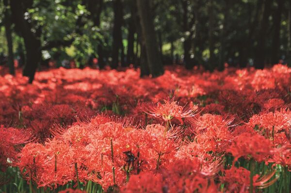 高麗川の蛇行でできた約22haの平地が巾着田。なかでも3.4haもの曼珠沙華群生地が見もので、9月中旬~10月上旬の開花期には、まるで赤いじゅうたんを敷き詰めたよう。