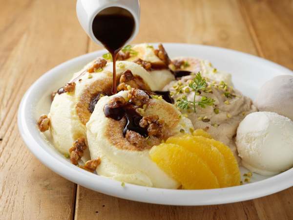 9月限定のメニューとして「パンケーキ カフェオレ」が登場。カフェオレ風味のエスプーマにほろ苦いコーヒーアイスと練乳アイスが甘さのハーモニーを奏で、刻みピスタチオとキャラメリゼしたクルミがアクセントに。