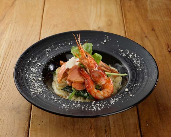 香ばしく炙ったサーモンとぷりぷりの海老を乗せた「炙りサーモンと海老のクリームパスタ」も見逃せない。ほうれん草と魚介の旨みが調和し、まろやかさと爽やかさを感じる濃厚なクリームソースがよく合う。「北海道産スルメイカと海老のアラビアータ」は噛むほどに旨みが広がってクセになる味わいだ。