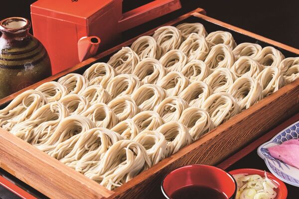 「へぎ」と呼ばれる木の器に幾重にも盛られたご当地そば