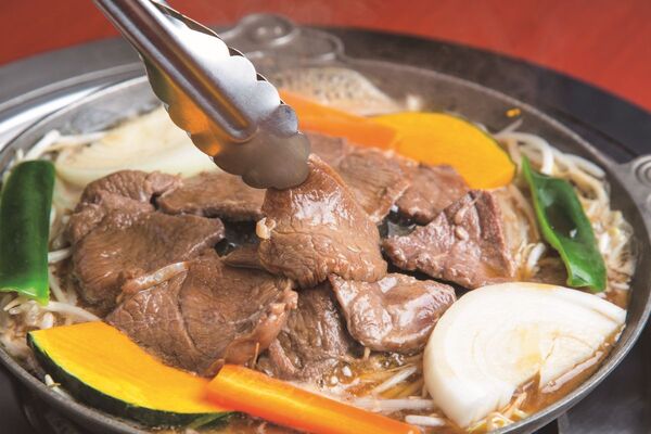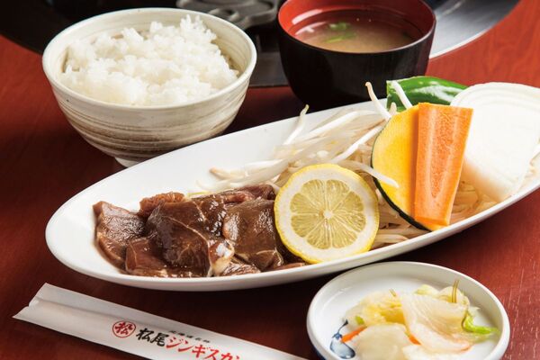 味付きジンギスカンの老舗「松尾ジンギスカン」の本店。秘伝の生タレに漬け込んだ、柔らかくジューシーな羊肉が堪能できる。肉汁とタレが染み込んだ野菜も絶品!