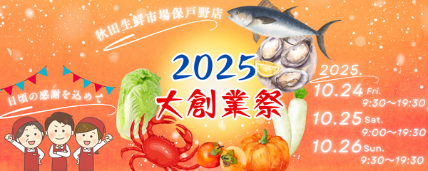 2025年10月24日から26日の3日間、秋田生鮮市場保戸野店で「大創業祭」が開催される。開店25周年を記念して、多くの特別商品とイベントを提供する。