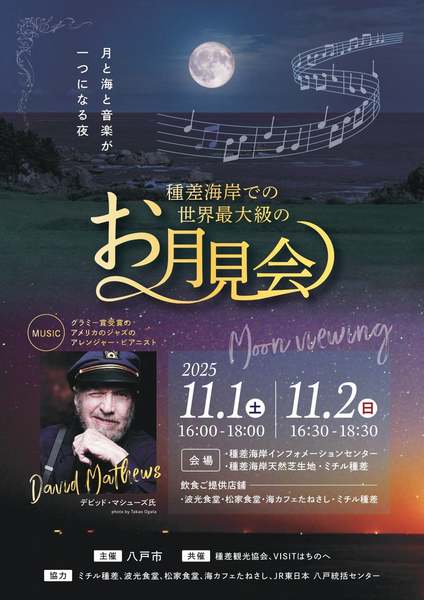 種差地域の飲食店も出店し、地元の味覚を満喫しながら月見を楽しめる。太平洋に面する名勝地である種差海岸は多くの植物が生息し、平成25年には三陸復興国立公園に指定されている。
