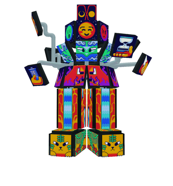 「キャラクターはことば」展では、たかくらかずきが生み出したオニやカッパ、十二支などのキャラクターが、展示会場内外に展示されている。ストーリーを持つコンテンポラリーアートとして展開され、会場に設置されたPCで実際にゲームをプレイすることができる。会場中央にある高さ約4mの巨大守護神「ハイパーマン」も見どころだ。