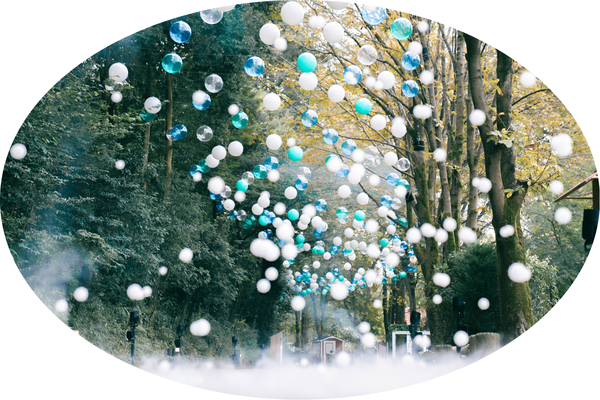 昼間はエントランスからムーミン谷エリアへと続く並木道にバルーンスカイが広がり、雪に見立てた「ホワイトバブル」が包み込む。シャボン玉がはじける瞬間にスモークが広がり、まるでムーミン谷の不思議な世界に迷い込んだよう。