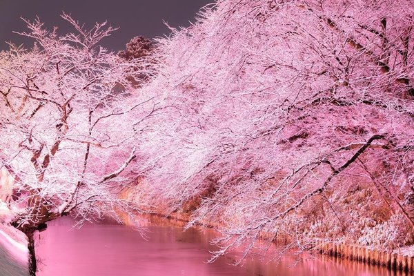 弘前公園の桜は「日本三大夜桜の一つ」ともいわれるほどの絶景を誇る。「冬に咲くさくらライトアップ」では、真冬の寒さの中、雪が積もった桜の枝をライトアップ。特に雪が多く積もると満開の桜のように見え、冬でもお花見が楽しめる。