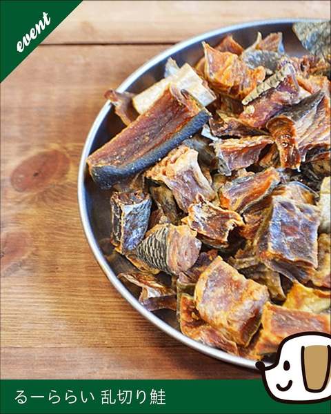 クリスマスコスチュームで来場したワンちゃんには、「乱切り鮭」をプレゼント。サンタさんからのうれしい贈り物だ。