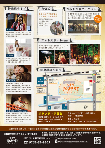 当日は竹灯篭の点灯式や、キッチンカーやクラフトブースが出店する「かみあかりマーケット」などが行われる。また、「神楽殿ライブ」ではシンガーやバイオリン奏者らが出演してイベントを盛り上げる。