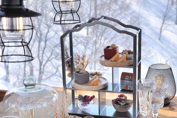 ゴンドラ内ではフィンガーフードを提供。チロルの食文化を取り入れ、サラミやチーズ、スイス風のスイーツなどが並ぶ。ドリンクは摘果りんごを使ったジュースやスパークリングワインなどを用意。