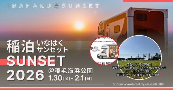2026年1月30日から2月1日までの3日間、稲毛海浜公園内の多目的広場(グラウンド)で車中泊イベント「稲泊サンセット 2026」を開催。幕張メッセで開催される国内最大級のキャンピングカーショー「ジャパンキャンピングカーショー(JCCS)2026」に合わせて実施するイベントで、展示会を楽しんだ来場者がそのまま愛車と共に特別な夜を過ごすことができる。
