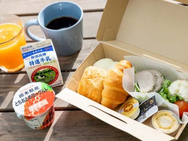 食事が部屋食なのもポイント。夕食は那須の名産「那須野ヶ原牛」や「那須御養卵」を使用したメニューが味わえる。ビールなどのドリンク付きなのもうれしい。朝食には、那須三元豚のローストポークや焼きたてパンを提供する。