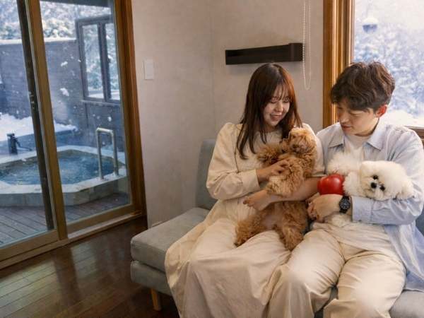 客室はプライベート露天風呂付き。愛犬専用の露天風呂も完備されており、ワンちゃんと一緒に温泉を楽しむことも可能だ。