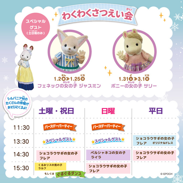 ウィンターフェスタでは、シルバニア村の仲間たちとの撮影会を実施。お気に入りのあの子と一緒に写真が撮れるチャンスだ。また、来場記念クイズラリーで全問正解するとシルバニアの赤ちゃん人形がもらえるところもうれしい。
