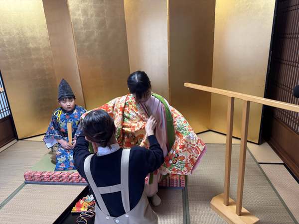 華やかな米沢織の衣装を着て、お雛様やお内裏様になりきることができる。マジックテープ仕様の簡略型十二単風の衣装は軽量で動きやすく、小さなお子様でも安心して着用できる。衣装の着付けは上杉伯爵邸のスタッフが担当し、約10分ほどで完了。その後は和室で家族のカメラを使用して撮影できる。
