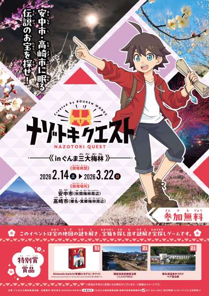 2026年3月22日まで、群馬県安中市と高崎市の梅林を舞台にした体験型謎解き宝探しゲームイベント「ナゾトキクエスト in ぐんま三大梅林2026」が開催中。小学生から大人まで参加可能で、必要な参加用冊子は群馬県内の各地で無料配布している。