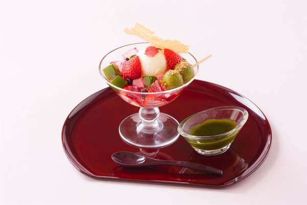 鮮やかな桜色の寒天とほろ苦い抹茶寒天が印象的な和パフェ。赤えんどう豆とミルクジェラートをトッピングし、さらに串だんごもオン。別添えの「特製濃厚抹茶くずソース」をかけることで抹茶の香りが広がり、あまおうの甘みとの調和が楽しめる。