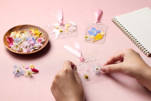 色とりどりの花で装飾された「花咲くアーチ」をくぐると、全長160mホタルストリートにはさまざまな色の花が敷き詰められた「花咲くカーペット」が広がる。写真撮影にもおすすめのスポットだ。トマムらしい建物や牛などをモチーフにした台紙に、数種類の中から選んだ花を使ってしおりを作る「花咲くしおり作り」も体験できる。