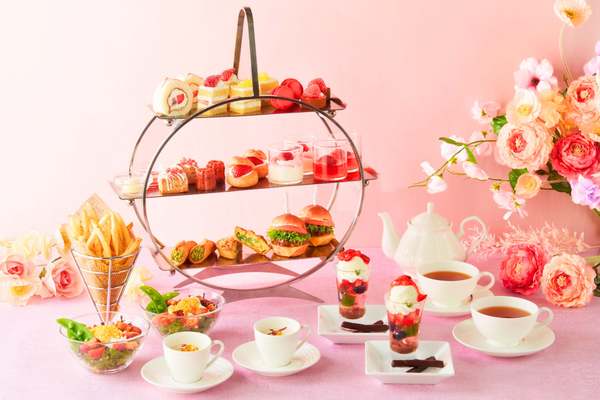 『いちごアフタヌーンティーセット』では、静岡県産のマスクメロンを贅沢に使用した「スーパーメロンショートケーキ」やあまおうを主役にした「新スーパーあまおうショートケーキ」が楽しめる。ほか、「あまおうゼリー」や「いちごパンナコッタ」、ホテルメイドの「ストロベリースコーン」など、いちごスイーツがずらり。