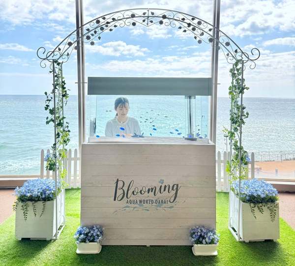 「ブルーミング アクアワールド・大洗」では、太平洋と青空、そしてネモフィラの花びらの青を再現した特設水槽を設置、デバスズメダイやルリスズメダイといった可憐な青い魚たちが空中を舞うように泳ぐ様子を見ることができる。水槽の裏側に回ることで、全体をブルーに染めた没入感のある写真撮影も楽しめる。