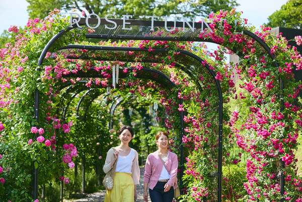 オリジナルバラ「ユイット・カンパーニュ」から始まる12品種12色のグラデーションカラーに包まれる全長60m「バラのトンネル」や、11色100品種の鮮やかなバラの色彩を堪能できるエリアなど、園内はバラづくしで写真撮影も捗りそう。
