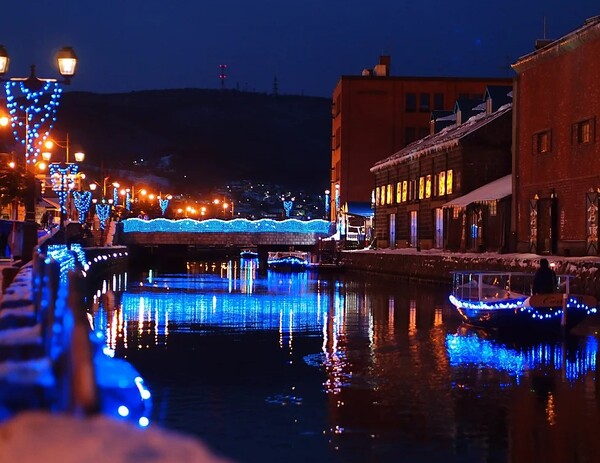 おすすめは日没後で、まだ空に青みが残るブルーアワーの時間帯。イルミネーションの青と空の蒼が相まって、幻想的な小樽運河を楽しむことができるという。